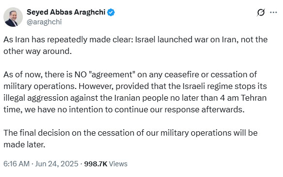 ट्रंप की घोषणा के कुछ घंटे बाद ही ईरान के विदेश मंत्री अब्बास अरागची ने साफ कर दिया कि कोई अंतिम सीजफायर नहीं हुआ है। उन्होंने कहा कि, अगर इजराइल हमले रोकता है तो हम भी हमले नहीं करेंगे। लेकिन अब तक कोई लिखित या औपचारिक युद्धविराम नहीं हुआ है।