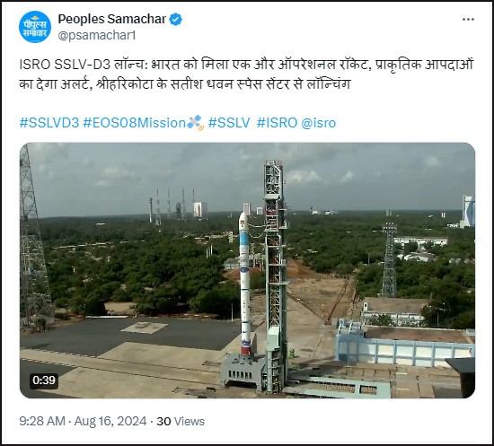 चेन्नई। इंडियन स्पेस रिसर्च ऑर्गेनाइजेशन (ISRO) ने श्रीहरिकोटा के सतीश धवन स्पेस सेंटर से SSLV-D3 रॉकेट की सफल लॉन्चिंग की। देश के सबसे छोटे रॉकेट SSLV-D3 के अंदर नया अर्थ ऑब्जरवेशन सैटेलाइट EOS-8 लॉन्च किया गया। यह सैटेलाइट पृथ्वी की कक्षा से बाहर करीब 475 किमी ऊपर स्थापित किया जाएगा। यह एक साल तक काम करेगा।