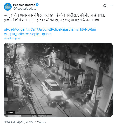 जयपुर। राजस्थान की राजधानी जयपुर में सोमवार रात एक दिल दहला देने वाली घटना सामने आई। शराब के नशे में धुत एक फैक्ट्री मालिक ने तेज रफ्तार SUV कार से सड़क पर कोहराम मचा दिया। आरोपी ने शहर के व्यस्त इलाकों में करीब 7 किलोमीटर तक कार दौड़ाई और इस दौरान 9 लोगों को कुचल दिया, जिनमें से 3 की दर्दनाक मौत हो गई और कई गंभीर रूप से घायल हो गए।