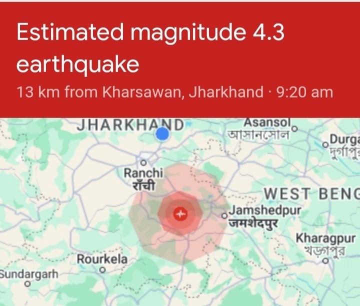 रांची। झारखंड के कई हिस्सों में शनिवार को भूकंप के तेज झटके महसूस किए गए। रिक्टर स्केल पर इसकी तीव्रता 4.3 मापी गई। भूकंप के झटके राजधानी रांची और जमशेदपुर के कई इलाकों में महसूस किए गए। झारखंड के खरसावां जिले से 13 किलोमीटर दूर इलाके में भूकंप का एपिसेंटर पाया गया। शनिवार सुबह 9:20 बजे यहीं पर भूकंप आया था। वहीं चाईबासा के चक्रधरपुर में भी भूकंप के झटकों से डरकर लोग घरों से बाहर आ गए। फिलहाल किसी तरह के कोई नुकसान की खबर नहीं है।
