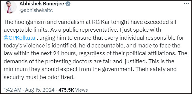 उन्होंने सोशल मीडिया मंच ‘एक्स' पर लिखा, ‘‘आज रात आरजी कर में गुंडागर्दी और बर्बरता की सभी सीमाएं लांघ दी गईं। प्रदर्शनकारी चिकित्सकों की मांगें उचित और न्यायसंगत हैं। वे सरकार से कम से कम इतनी उम्मीद तो सकते हैं। उनकी सुरक्षा को प्राथमिकता दी जानी चाहिए।