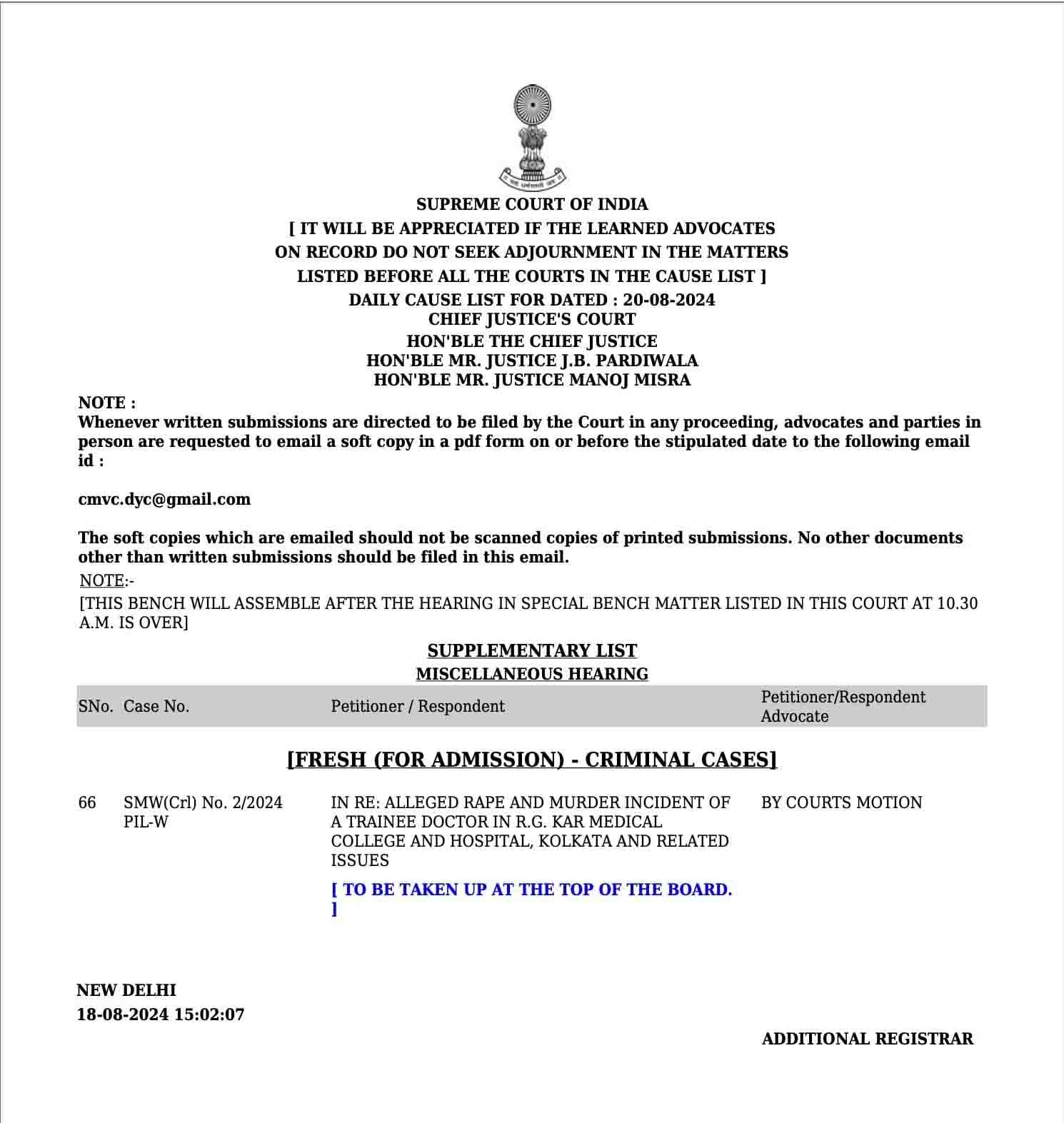 सुप्रीम कोर्ट ने रविवार (18 अगस्त) को कोलकाता में ट्रेनी डॉक्टर से रेप-मर्डर के मामले में स्वत: संज्ञान लिया है। 20 अगस्त को चीफ जस्टिस (CJI) डीवाई चंद्रचूड़, जस्टिस जेबी पादरीवाला और जस्टिस मनोज मिश्रा की बेंच इस मामले की सुनवाई करेगी। सुप्रीम कोर्ट की वेबसाइट पर अपलोड की गई 20 अगस्त की वाद सूची के अनुसार, चीफ जस्टिस डीवाई. चंद्रचूड़ की अध्यक्षता वाली पीठ मंगलवार को इस मामले पर सुनवाई करेगी।