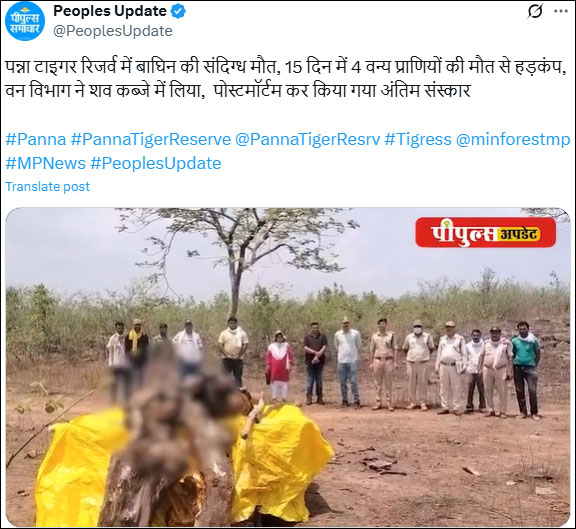 घटना की जानकारी मिलते ही वन विभाग की टीम मौके पर पहुंची और बाघिन के शव को कब्जे में लिया। पोस्टमार्टम के बाद शव का अंतिम संस्कार कर दिया गया है। हालांकि, मौत की असली वजह अभी स्पष्ट नहीं हो पाई है।