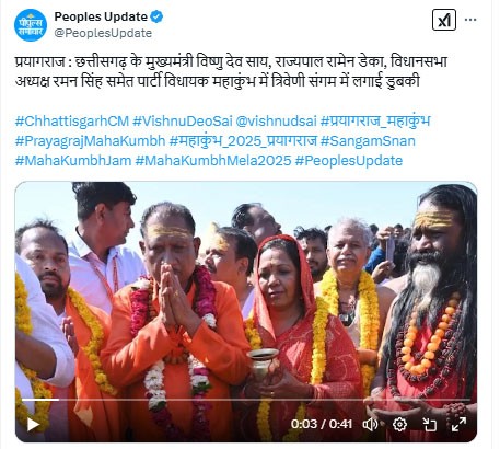 छत्तीसगढ़ के मुख्यमंत्री विष्णु देव साईं, मंत्रिपरिषद, विधानसभा अध्यक्ष, राज्यपाल, सांसदों और विधायकों के साथ प्रयागराज में महाकुंभ में भाग लेने के लिए 166 सदस्यीय दल का नेतृत्व कर रहे हैं।