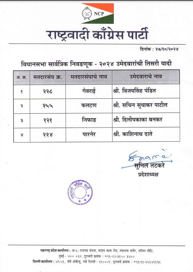 Maharashtra Assembly Election 2024। महाराष्ट्र विधानसभा चुनाव को लेकर रविवार (27 अक्टूबर) को NCP (अजित गुट) ने तीसरी लिस्ट जारी कर दी है। अपनी इस सूची में पार्टी ने 4 प्रत्याशियों के नाम का ऐलान किया है। इसमें गेवराई से विजयसिंह पंडित, फलटण से सचिन सुधाकर, निफाड से दिलीपकाका बनकर और पारनेर से काशिनाथ दाते को टिकट दिया गया है।