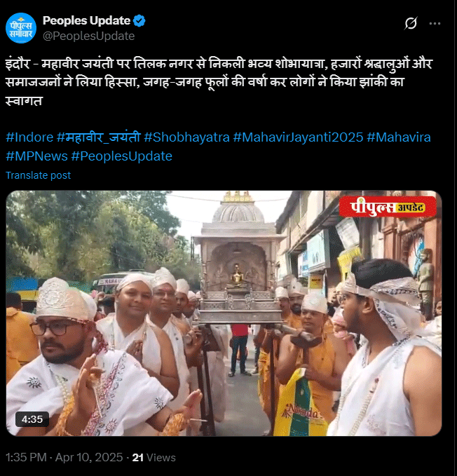 इंदौर में श्वेतांबर जैन समाज द्वारा निकाली गई। शोभायात्रा में विशेष आकर्षण का केंद्र रहा चांदी का रथ, जिसे 108 युवाओं ने खींचा। यात्रा की शुरुआत ऐतिहासिक राजवाड़ा से हुई और इसमें पंजाब और कर्नाटक से आई नृत्य मंडलियों ने अपनी प्रस्तुतियां दीं। महावीर बाग के पास रथयात्रा के कारण कुछ समय के लिए ट्रैफिक बाधित हुआ, लेकिन श्रद्धालुओं का उत्साह देखने लायक था। इंदौर के तिलक नगर क्षेत्र से भी भगवान महावीर की जयंती पर एक विशाल शोभायात्रा का आयोजन किया गया। यह आयोजन न केवल क्षेत्रीय स्तर पर बल्कि पूरे शहर में धार्मिक उत्साह और समर्पण का प्रतीक बनकर उभरा।