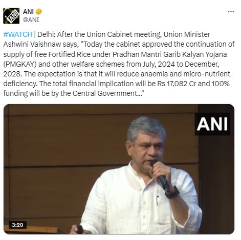 बैठक के बाद सूचना एवं प्रसारण मंत्री अश्विनी वैष्णव ने यहां संवाददाताओं को बताया कि फोर्टिफाईड चावल की पीएमजीकेएवाई (खाद्य सब्सिडी) के हिस्से के रूप में सरकार के शत प्रतिशत वित्त पोषण के साथ जारी रहेगी। वर्ष 2019 और वर्ष 2021 के बीच किए गए राष्ट्रीय परिवार स्वास्थ्य सर्वेक्षण के अनुसार, देश में एनीमिया एक व्यापक समस्या बनी हुई है, जो विभिन्न आयु समूहों और आय स्तरों के बच्चों, महिलाओं और पुरुषों को प्रभावित करती है।