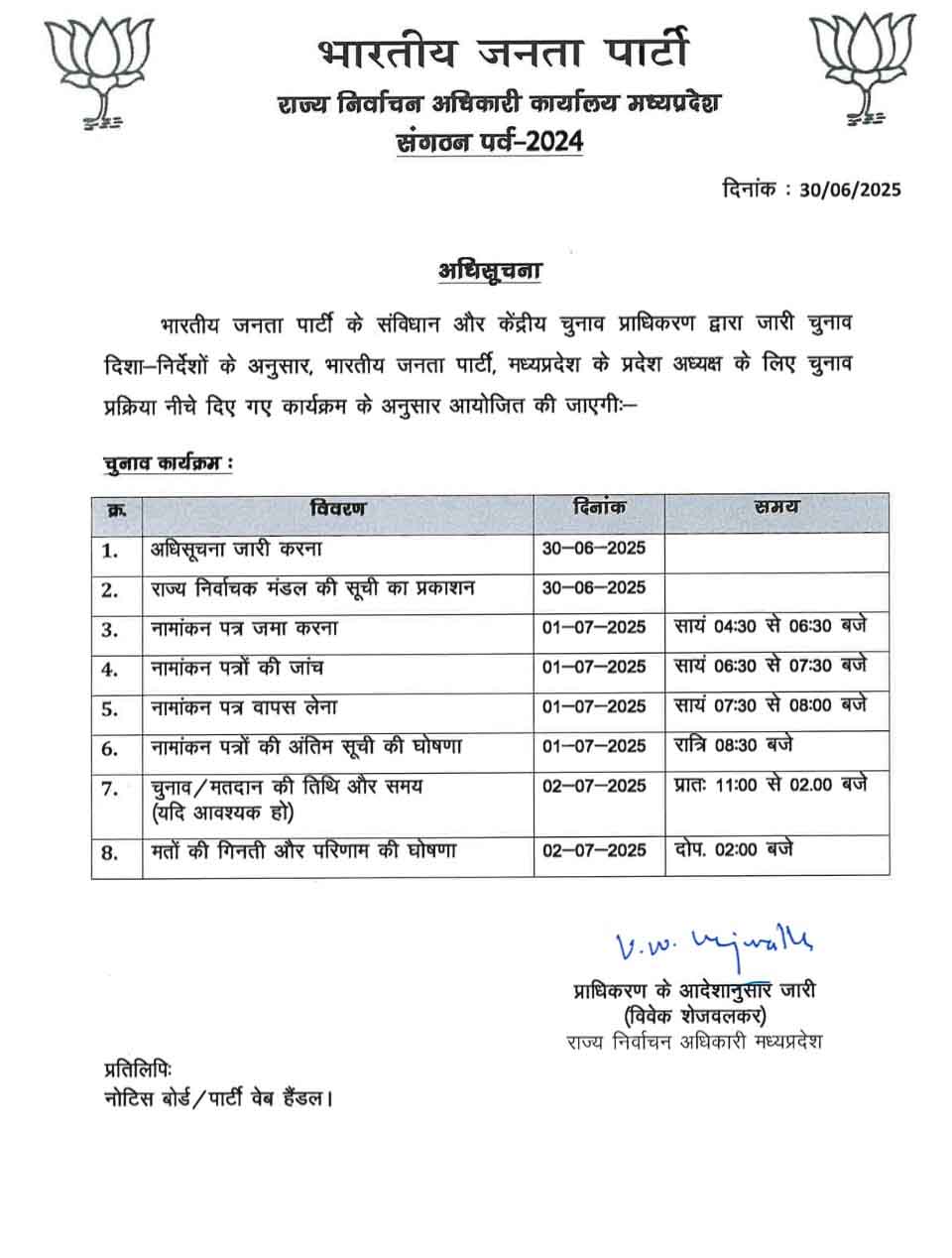 भोपाल। मध्य प्रदेश में भारतीय जनता पार्टी को दो दिन बाद नया प्रदेश अध्यक्ष मिलने जा रहा है। सोमवार को पार्टी की ओर से चुनाव कार्यक्रम की आधिकारिक घोषणा कर दी गई है। प्रदेश चुनाव अधिकारी विवेक शेजवलकर ने चुनाव की अधिसूचना जारी कर दी है। प्रदेश अध्यक्ष के लिए चुनाव की प्रक्रिया 1 जुलाई से शुरू होकर 2 जुलाई को पूरी हो जाएगी।
