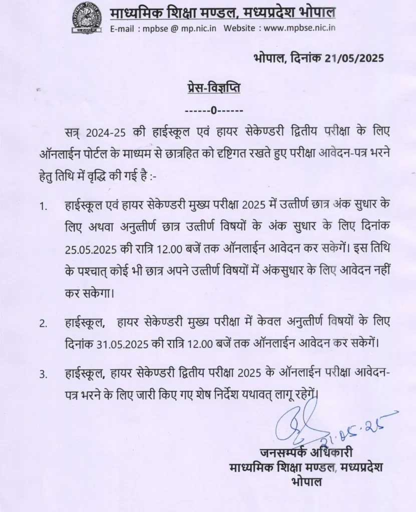 भोपाल। मध्य प्रदेश माध्यमिक शिक्षा मंडल (MPBSE) ने सत्र 2024-25 की हाईस्कूल (कक्षा 10वीं) और हायर सेकेंडरी (कक्षा 12वीं) की मुख्य परीक्षा में शामिल हुए छात्रों के लिए राहत भरी खबर दी है। बोर्ड ने अंक सुधार और पूरक (द्वितीय) परीक्षा के लिए ऑनलाइन आवेदन की तिथियों को बढ़ा दिया है।