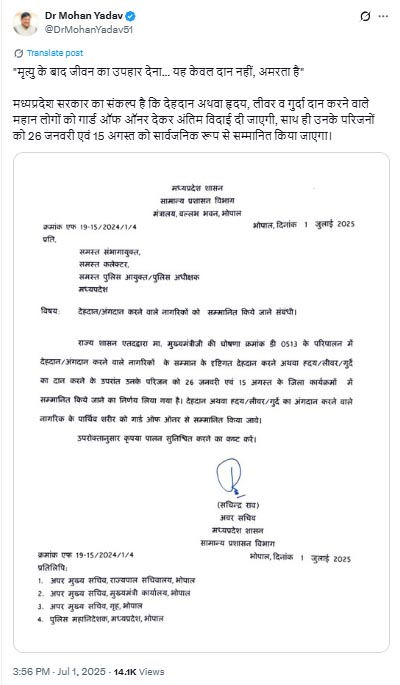 मुख्यमंत्री डॉ. मोहन यादव ने इस फैसले की जानकारी सोशल मीडिया प्लेटफॉर्म X पर देते हुए लिखा- “मृत्यु के बाद जीवन का उपहार देना… यह केवल दान नहीं, अमरता है। मध्यप्रदेश सरकार का संकल्प है कि देहदान अथवा हृदय, लीवर व गुर्दा दान करने वाले महान लोगों को गार्ड ऑफ ऑनर देकर अंतिम विदाई दी जाएगी, साथ ही उनके परिजनों को 26 जनवरी एवं 15 अगस्त को सार्वजनिक रूप से सम्मानित किया जाएगा।”
