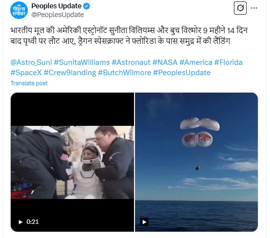 सुनीता विलियम्स को ड्रैगन कैप्सूल से बाहर निकाला गया। यह वह पल था, जब सुनीता विलियम्स ने नौ महीने बाद पहली बार ग्रैविटी (Gravity) को महसूस किया। इस दौरान उनके चेहरे पर खुशी दिख रही थी। उन्होंने हाथ हिलाकर वहां मौजूद लोगों का अभिवादन किया।
