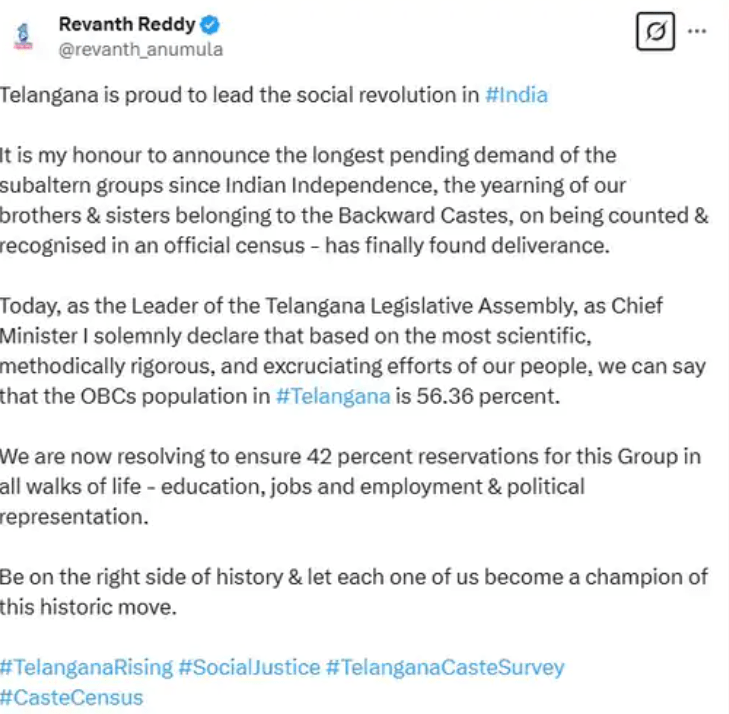 सीएम रेवंत रेड्डी ने विधानसभा में कहा- ‘कांग्रेस नेता राहुल गांधी ने वादा किया था कि अगर कांग्रेस सत्ता में जा जाती है तो, OBC आरक्षण को बढ़ाकर 42 प्रतिशत किया जाएगा। सत्ता संभालने के तुरंत बाद, हमारी सरकार ने जाति जनगणना शुरू की। पहले कांग्रेस सरकार ने OBC आरक्षण को 37 प्रतिशत तक बढ़ाने के लिए राज्यपाल को प्रस्ताव भेजा था। यह सरकार पहले के प्रस्ताव को वापस ले रही है, अब 42 प्रतिशत आरक्षण का नया प्रस्ताव भेज रही है।’