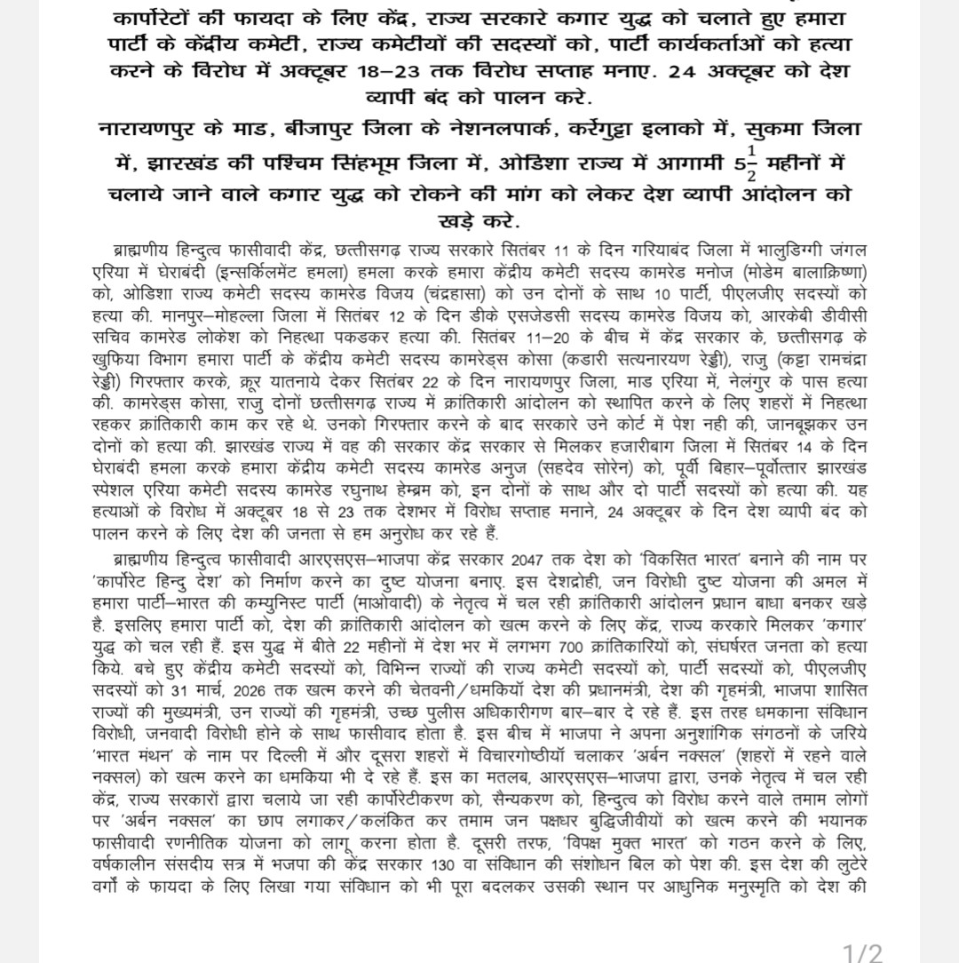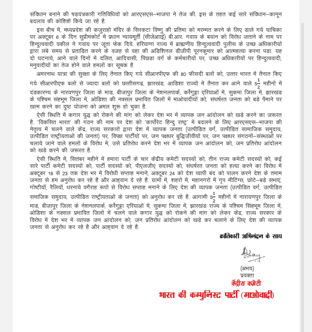 नक्सल संगठन की ओर से ‘नक्सली अभय’ के नाम से दो पेज का पर्चा जारी किया गया है। इसमें दावा किया गया है कि साल 2022 से अब तक सुरक्षा बलों ने करीब 700 नक्सलियों और आम नागरिकों की हत्या की है। पर्चे में प्रधानमंत्री और केंद्रीय गृह मंत्री के उस बयान का भी जिक्र किया गया है, जिसमें कहा गया था कि 31 मार्च 2026 तक देश से नक्सलवाद खत्म कर दिया जाएगा।