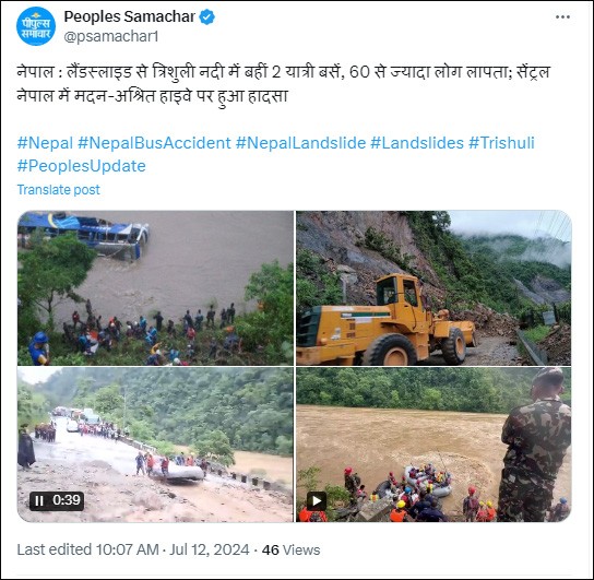 नेपाल के प्रधानमंत्री पुष्प कमल दहल ने हादसे पर दुख जताया है। उन्होंने सोशल मीडिया पर लिखा, 'नारायणगढ़-मुग्लिन रोड स्टेशन पर लैंडस्लाइड से बस बह जाने से लगभग पांच दर्जन यात्रियों के लापता होने की रिपोर्ट से मुझे काफी दुख हुआ है। मैं सरकार की सभी एजेंसियों को यात्रियों की खोज करने और उन्हें सही सलामत बचाने का निर्देश देता हूं।'