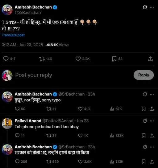 अमिताभ बच्चन ने देर रात एक पोस्ट किया – “जी हां, हिजूर मैं भी प्रशंसक हूं।” इसके कुछ ही मिनटों बाद उन्होंने फिर पोस्ट कर लिखा – “हुजूर, न कि हिजूर। लिखने की गलती, माफ करिए।” इस आत्मसुधार ने फैंस का दिल जीत लिया, लेकिन ट्रोलर्स को मौका मिल गया।