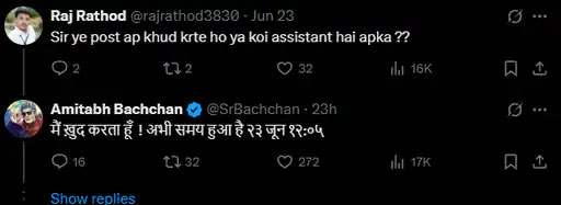 सोशल मीडिया पर फैंस ने बिग बी के अंदाज़ की जमकर तारीफ की। एक यूजर ने लिखा – “अमिताभ बच्चन अपने स्टाइल में हेटर्स को जवाब दे रहे हैं। चुप्पी ताकतवर होती है, लेकिन कभी-कभी जवाब देना भी जरूरी होता है।” इस पर बिग बी ने सहमति जताते हुए लिखा – “जी हां, यही सही है।”