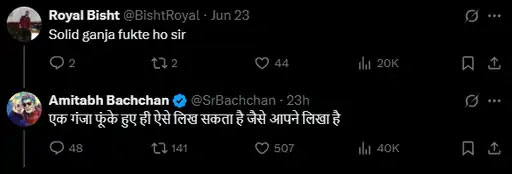 जब एक ट्रोलर ने बेहूदगी की हद पार करते हुए लिखा – “सॉलिड गांजा फूंकते हो”, तो बिग बी ने जवाब में लिखा – “एक गांजा फूंके हुए ही ऐसा लिख सकता है, जैसा आपने लिखा है।” इस जवाब ने सोशल मीडिया पर वाहवाही लूट ली।