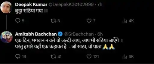 एक ट्रोलर ने टिप्पणी की – “बुड्ढा सठिया गया है।” इस पर अमिताभ बच्चन ने जवाब में लिखा – “एक दिन, भगवान न करे वो जल्दी आए, लेकिन आप भी सठिया जाएंगे। परंतु हमारे यहां एक कहावत है, जो साठा, वो पाठा।”