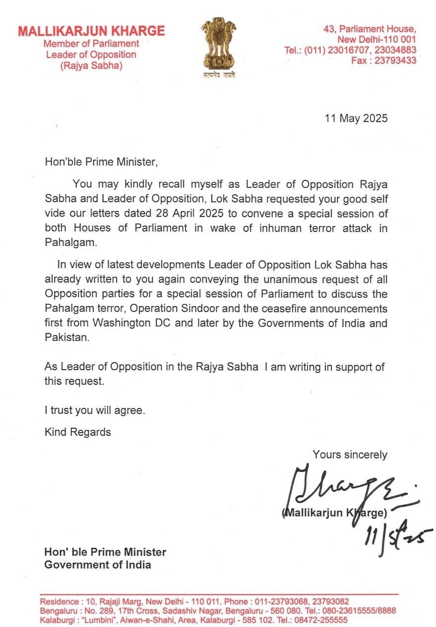 राज्यसभा में विपक्ष के नेता मल्लिकार्जुन खड़गे ने भी इस मांग का समर्थन किया है। अपने पत्र में उन्होंने याद दिलाया कि 28 अप्रैल को भी विपक्ष ने संसद का विशेष सत्र बुलाने की मांग की थी और अब हालात और भी गंभीर हो चुके हैं। उन्होंने कहा कि पहले अमेरिका की राजधानी वाशिंगटन डीसी से सीजफायर की घोषणाएं आईं, उसके बाद भारत और पाकिस्तान दोनों सरकारों ने इसकी पुष्टि की। खड़गे ने जोर दिया कि यह मांग किसी एक दल की नहीं बल्कि समूचे विपक्ष की एक साझा आवाज है।