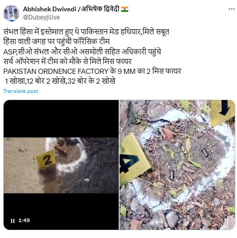 हिंसा वाली जगह पर पहुंची फॉरेंसिक टीम नालियां खंगाली तो सर्च ऑपरेशन में अफसरों की टीम को मौके से PAKISTAN ORDNANCE FACTORY के 9 MM के दो मिसफायर और एक खोखा बरामद हुआ। इसके अलावा 12 बोर 2 दो खोखे और 32 बोर के 2 खोखे भी बरामद किए गए। अभी सर्च ऑपरेशन में अधिकारी लगे हुए हैं।