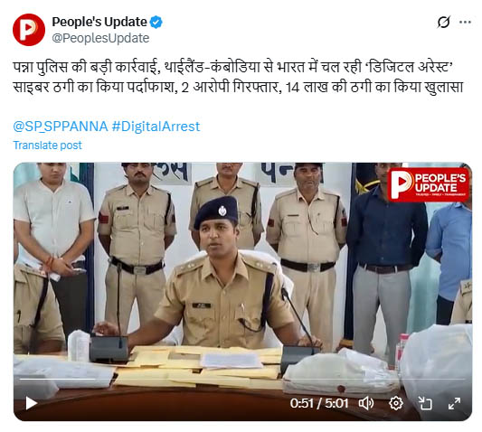 पन्ना पुलिस ने अंतरराष्ट्रीय साइबर ठगी नेटवर्क का बड़ा खुलासा करते हुए थाईलैंड और कंबोडिया से संचालित ‘डिजिटल अरेस्ट’ ठगी रैकेट में शामिल दो शातिर आरोपियों को गिरफ्तार किया है। आरोपियों ने एक स्थानीय युवक से 14 लाख रुपए की धोखाधड़ी की थी।