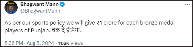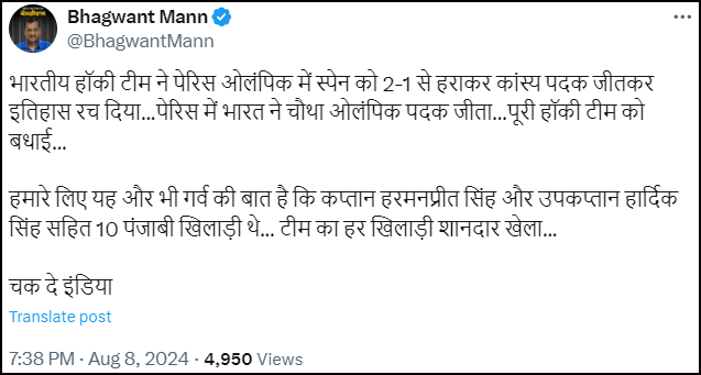 पंजाब के सीएम भगवंत मान ने एक्स पर पोस्ट शेयर कर लिखा- भारतीय हॉकी टीम ने पेरिस ओलिंपिक में स्पेन को 2-1 से हराकर ब्रॉन्ज मेडल जीतकर इतिहास रच दिया। पेरिस में भारत ने चौथा ओलिंपिक पदक जीता। पूरी हॉकी टीम को बधाई। हमारे लिए यह और भी गर्व की बात है कि कप्तान हरमनप्रीत सिंह और उपकप्तान हार्दिक सिंह सहित 10 पंजाबी खिलाड़ी थे। टीम का हर खिलाड़ी शानदार खेला। चक दे इंडिया...