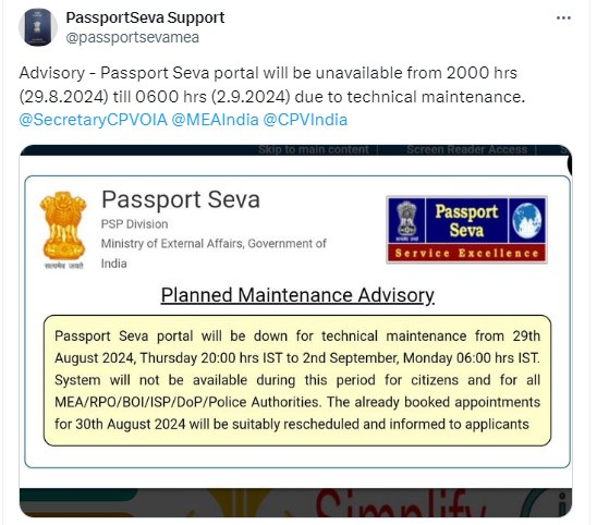 29 अगस्त से 2 सितंबर तक पूरे देश में पासपोर्ट विभाग का पोर्टल काम नहीं करेगा। इसकी जानकारी पासपोर्ट सेवा पोर्टल ने दी है। एक्स पर पोस्ट करते हुए लिखा गया है कि तकनीकी रखरखाव के कारण पासपोर्ट सेवा पोर्टल 2000 बजे (29.8.2024) से 6 बजे (2.9.2024) तक अनुपलब्ध रहेगा। इस अवधि के दौरान नागरिकों और सभी एमईए/आरपीओ/बीओआई/आईएसपी/डीओपी/पुलिस अधिकारियों के लिए सिस्टम उपलब्ध नहीं होगा। 30 अगस्त 2024 के लिए पहले से बुक की गई नियुक्तियों को उपयुक्त रूप से पुनर्निर्धारित किया जाएगा और आवेदकों को सूचित किया जाएगा।’