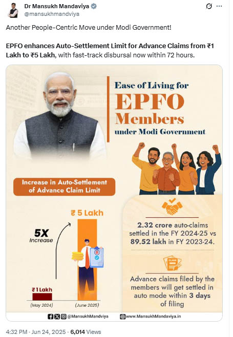 केंद्रीय मंत्री मनसुख मंडाविया ने कहा, यह फैसला श्रमिकों को निर्बाध और समय पर सहायता देने के लिए लिया गया है। अब किसी भी इमरजेंसी में कर्मचारी 5 लाख तक का एडवांस बिना किसी बाधा के प्राप्त कर सकेंगे।