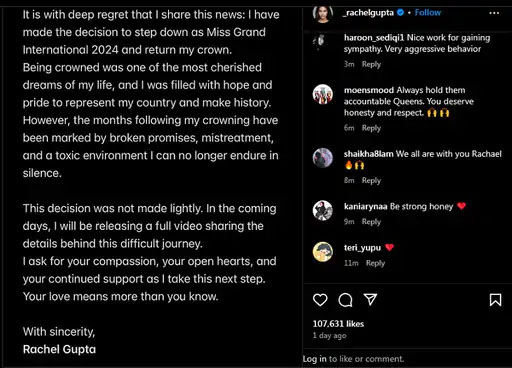 रेचल का यह बयान ब्यूटी कॉन्टेस्ट की वित्तीय पारदर्शिता और नैतिकता पर भी सवाल खड़े करता है। उन्होंने आरोप लगाया कि यह पूरा सिस्टम पे-टू-विन की भावना से चलता है, जहां बिना आर्थिक समर्थन के प्रतिभा दम तोड़ देती है।