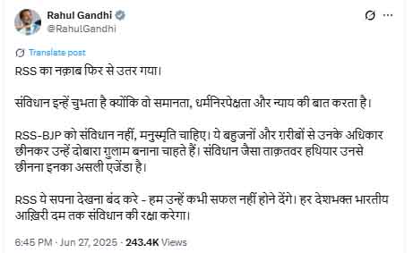 होसबाले के बयान पर प्रतिक्रिया देते हुए राहुल गांधी ने X (पूर्व ट्विटर) पर लिखा- “RSS का नकाब फिर उतर गया। संविधान इन्हें चुभता है, क्योंकि वह समानता, धर्मनिरपेक्षता और न्याय की बात करता है। RSS-BJP को संविधान नहीं, मनुस्मृति चाहिए। ये लोग बहुजनों और गरीबों से उनके अधिकार छीनकर उन्हें दोबारा गुलाम बनाना चाहते हैं।”