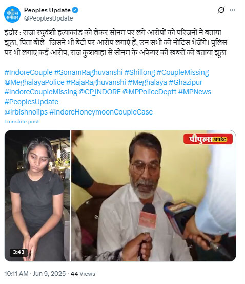 वहीं सोनम के पिता देवी सिंह ने साफ कहा कि, मेघालय पुलिस झूठ बोल रही है। उन्होंने गृह मंत्री अमित शाह से इस केस में CBI जांच की मांग की और दावा किया कि उनकी बेटी निर्दोष है। उन्होंने बोला- मेरी बेटी बेगुनाह हैं... राज कुशवाह नाम का कोई लड़का जान पहचान में नहीं हैं... पुलिस जो आरोप लगा रही हैं वो झूठा हैं... पुलिस अपने बचाव के लिए सोनम पर आरोप लगा रही हैं...