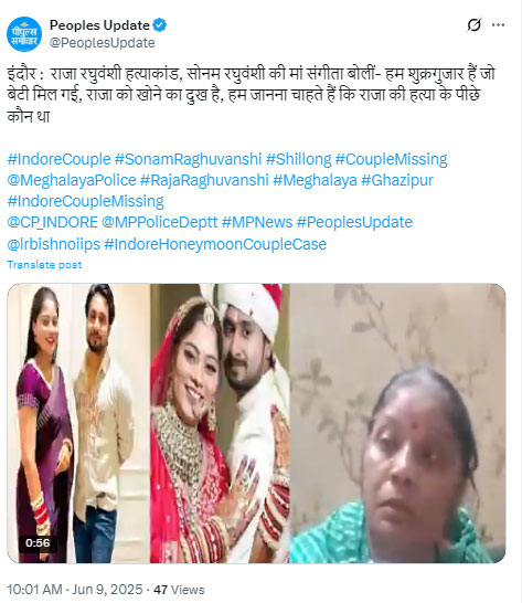 सोनम की मां संगीता ने मीडिया से बातचीत में कहा, “हम शुक्रगुजार हैं जो बेटी मिल गई, लेकिन दिल में अब भी दर्द है… अब हम जानना चाहते हैं कि राजा की हत्या के पीछे कौन था। बेटी लौटी है, लेकिन राजा को हमने खो दिया…”