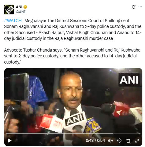 वकील तुषार चंदा ने मीडिया को बताया- 'सोनम रघुवंशी और राज कुशवाह को दो दिन की रिमांड पर भेजा गया है। बाकी तीनों को 14 दिन तक न्यायिक हिरासत में रखा जाएगा।'