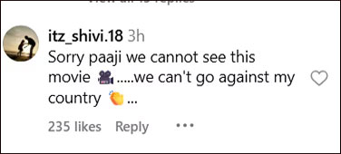 एक यूजर ने लिखा- “सॉरी पाजी, हम ये फिल्म नहीं देखेंगे। हमें अपने देश से बढ़कर कुछ नहीं।”