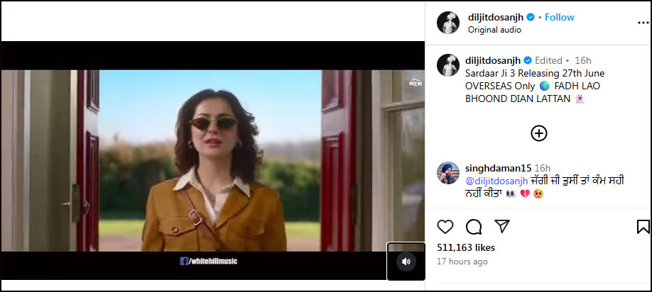 फिल्म के निर्माताओं ने यह साफ किया है कि ‘सरदार जी 3’ केवल विदेशों में रिलीज होगी। स्टूडियो की ओर से जारी बयान में कहा गया, “फिल्म 27 जून को विदेशों में रिलीज़ की जाएगी। भारत में रिलीज फिलहाल रोक दी गई है।”