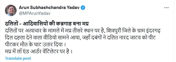 पूर्व केंद्रीय मंत्री और कांग्रेस के पूर्व प्रदेश अध्यक्ष अरुण यादव ने एक्स पर लिखा- 'दलितों - आदिवासियों की कब्रगाह बना मप्र, दलितों पर अत्याचार के मामले में मप्र तीसरे स्थान पर है। शिवपुरी जिले के ग्राम इंदरगढ़ दिल दहला देने वाला वीडियो सामने आया, जहां दबंगों ने दलित नारद जाटव को पीट पीटकर मौत के घाट उतार दिया। मप्र में लॉ एंड आर्डर वेंटिलेटर पर है।'