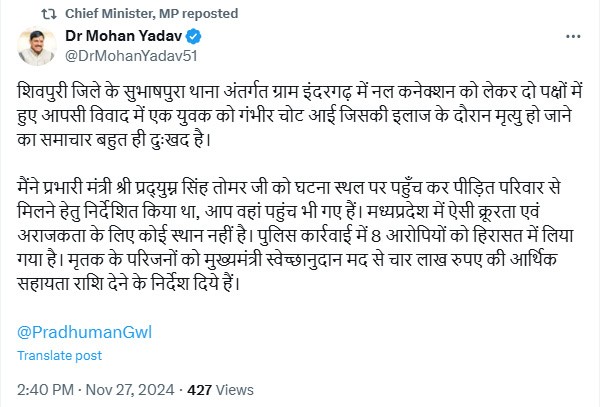 इस मामले में सीएम डॉ. मोहन यादव ने एक्स पर पोस्ट कर लिखा- 'शिवपुरी जिले के सुभाषपुरा थाना अंतर्गत ग्राम इंदरगढ़ में नल कनेक्शन को लेकर दो पक्षों में हुए आपसी विवाद में एक युवक को गंभीर चोट आई जिसकी इलाज के दौरान मृत्यु हो जाने का समाचार बहुत ही दुःखद है। मैंने प्रभारी मंत्री प्रद्युम्न सिंह तोमर को घटनास्थल पर पहुंचकर पीड़ित परिवार से मिलने हेतु निर्देशित किया था, आप वहां पहुंच भी गए हैं। मध्यप्रदेश में ऐसी क्रूरता एवं अराजकता के लिए कोई स्थान नहीं है। पुलिस कार्रवाई में 8 आरोपियों को हिरासत में लिया गया है। मृतक के परिजनों को मुख्यमंत्री स्वेच्छानुदान मद से 4 लाख रुपए की आर्थिक सहायता राशि देने के निर्देश दिए हैं।'