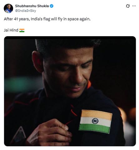 मिशन लॉन्चिंग से पहले शुभांशु शुक्ला ने सोशल मीडिया पर एक पोस्ट किया। इसमें उन्होंने लिखा, “41 साल बाद फिर अंतरिक्ष में लहराएगा भारत का परचम।”