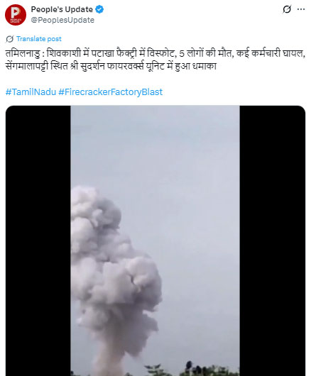 शिवकाशी। तमिलनाडु के शिवकाशी में मंगलवार सुबह एक निजी पटाखा फैक्ट्री में जोरदार विस्फोट हुआ। हादसे में अब तक 4 लोगों की मौत हो चुकी है और 5 लोग गंभीर रूप से झुलस गए हैं। हादसा इतना भयानक था कि, धमाके की आवाज एक किलोमीटर से अधिक दूरी तक सुनाई दी। घटना विरुधुनगर जिले के चिन्नाकामनपट्टी गांव की बताई जा रही है, जहां विस्फोट के बाद फैक्ट्री से भारी धुआं निकलने लगा।