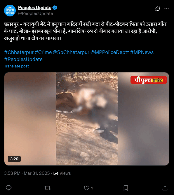 मध्यप्रदेश के खजुराहो से दिल देहला देने वाला मामला सामने आया है। जहां मानसिक रूप से पीड़ित एक युवक ने हनुमान मंदिर में रखी गदा से पीट-पीटकर अपने पिता को मौत के घाट उतार दिया। साथ ही उसने चचेरे भाई महेश पाल पर भी हमला किया। जिसे गंभीर हालत में अस्पताल में भर्ती कराया गया है।