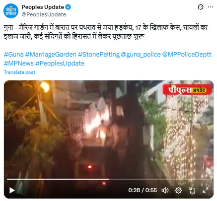 गुना। शहर के बीजी रोड क्षेत्र में उस वक्त अफरा-तफरी का माहौल बन गया जब देर रात एक मैरिज गार्डन में बारात के दौरान अचानक कुछ असामाजिक तत्वों ने पथराव कर दिया। यह घटना शहर के शहनाई गार्डन के पास हुई, जहां ग्राम बरखेड़ा निवासी शर्मा परिवार की बारात समारोह चल रहा था। पथराव की घटना में एक व्यक्ति घायल हो गया, जिसे उपचार के लिए जिला अस्पताल में भर्ती कराया गया है। वहीं मौके पर पहुंची पुलिस ने 17 आरोपियों के खिलाफ मामला दर्ज कर लिया है और कई संदिग्धों को हिरासत में लेकर पूछताछ शुरू कर दी है।