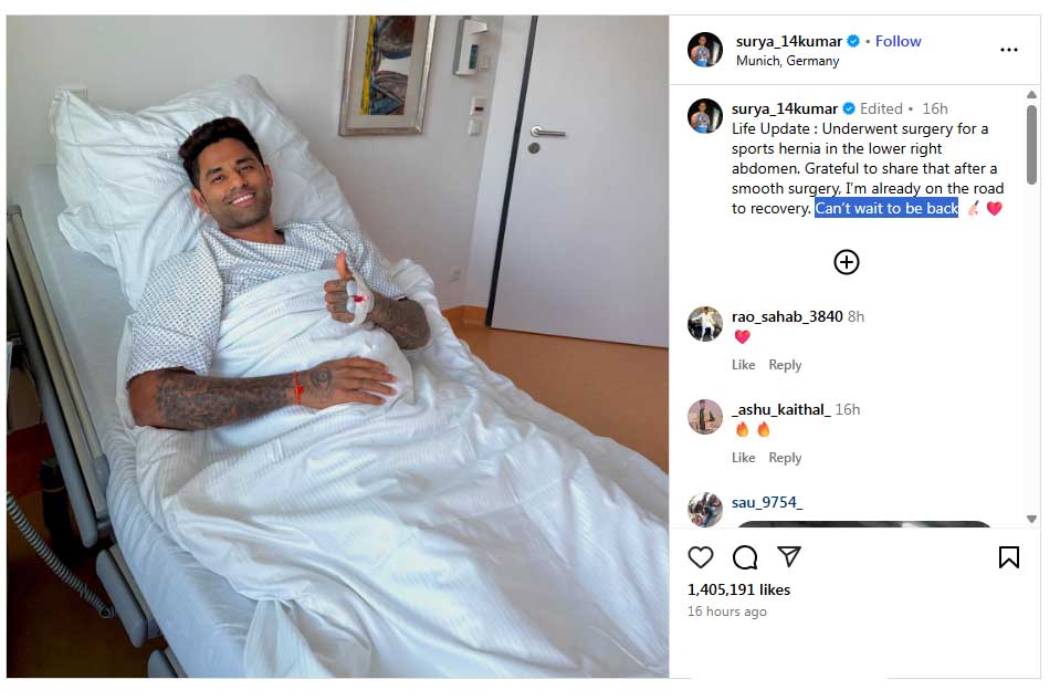सूर्यकुमार यादव ने इंस्टाग्राम पर लिखा- ‘लाइफ अपडेट: दाहिने निचले पेट में स्पोर्ट्स हर्निया की सर्जरी कराई। खुशी है कि सर्जरी सफल रही और अब मैं रिकवरी होने की राह पर हूं। वापसी का इंतजार नहीं कर सकता।’