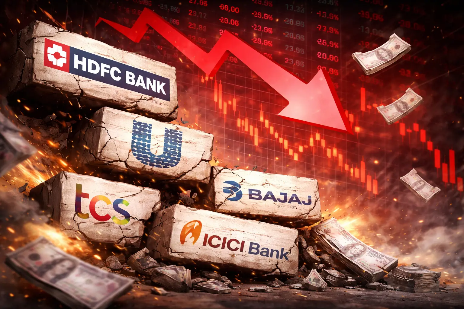 मार्केट कैप में बड़ी गिरावट!टॉप-10 कंपनियों के ₹1 लाख करोड़ से ज्यादा घटे, HDFC बैंक समेत 5 कंपनियों को नुकसान