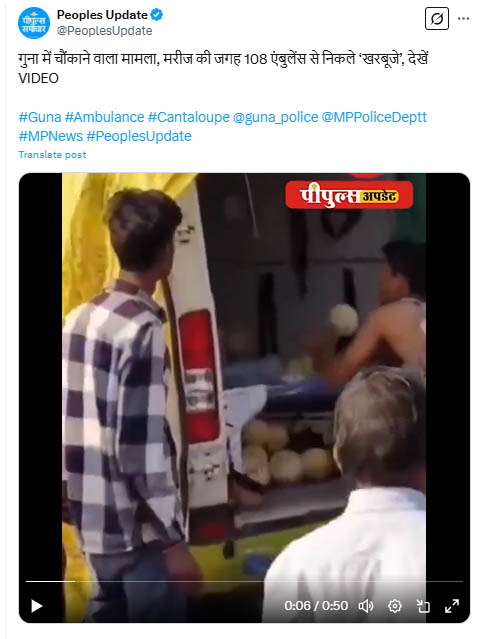 गुना। मरीजों को अस्पताल पहुंचाने के लिए चलाई गई सरकारी 108 एम्बुलेंस सेवा का दुरुपयोग सामने आया है। गुरुवार सुबह गुना की नानाखेड़ी रोड स्थित आढ़त मंडी में एक उत्तर प्रदेश की सरकारी एम्बुलेंस फलों से लदी हुई पहुंची। इस घटना का वीडियो सोशल मीडिया पर वायरल हो रहा है।