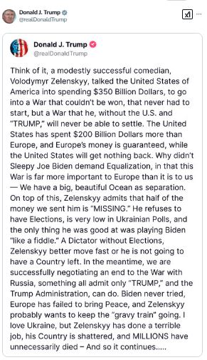 ट्रंप ने अपने सोशल मीडिया प्लेटफॉर्म ट्रुथ सोशल पर पोस्ट करते हुए कहा कि जेलेंस्की "चुनाव के बिना तानाशाह" हैं। उन्होंने यह भी आरोप लगाया कि एक मामूली सफल हास्य अभिनेता (जेलेंस्की) ने अमेरिका को 350 अरब डॉलर खर्च करने के लिए मजबूर किया, एक ऐसे युद्ध में जिसे कभी शुरू नहीं किया जाना चाहिए था और जिसे जीता नहीं जा सकता था।
