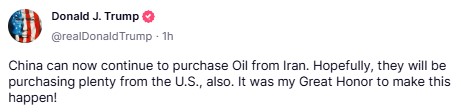 डोनाल्ड ट्रंप ने अपने सोशल मीडिया प्लेटफॉर्म ट्रुथ सोशल पर पोस्ट कर कहा, “चीन अब ईरान से तेल खरीदना जारी रख सकता है। उम्मीद है कि वे अमेरिका से भी भरपूर तेल खरीदेंगे।”
