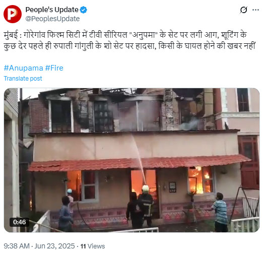 मुंबई। गोरेगांव स्थित फिल्म सिटी में सोमवार सुबह लोकप्रिय टीवी सीरियल ‘अनुपमा’ के सेट पर भीषण आग लग गई। यह हादसा सुबह करीब 5 बजे हुआ, जब सेट पर शूटिंग की तैयारी चल रही थी। घटना के समय कलाकारों की शिफ्ट शुरू नहीं हुई थी, इसलिए कोई जनहानि नहीं हुई। लेकिन सेट को भारी नुकसान हुआ है और लाखों-करोड़ों की संपत्ति जलकर राख हो गई।