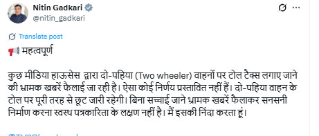 गडकरी ने अपने आधिकारिक पोस्ट में लिखा– कुछ मीडिया हाउसेज द्वारा दो-पहिया (Two-Wheeler) वाहनों पर टोल टैक्स लगाए जाने की भ्रामक खबरें फैलाई जा रही हैं। ऐसा कोई निर्णय प्रस्तावित नहीं है। दो-पहिया वाहन के टोल पर पूरी तरह से छूट जारी रहेगी। उन्होंने आगे लिखा- बिना सच्चाई जाने भ्रामक खबरें फैलाकर सनसनी निर्माण करना स्वस्थ पत्रकारिता के लक्षण नहीं हैं। मैं इसकी निंदा करता हूं।