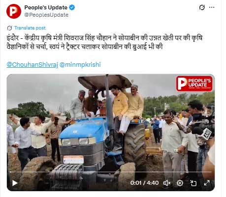 इस मौके पर शिवराज सिंह चौहान ने ICAR-राष्ट्रीय सोयाबीन अनुसंधान संस्थान में आयोजित कार्यक्रम में भाग लिया। उन्होंने वहां मौजूद वैज्ञानिकों, विशेषज्ञों और किसानों से संवाद किया और नई बुआई तकनीकों का निरीक्षण भी किया। उन्होंने खुद ट्रैक्टर चलाकर बुआई की और इसे खेती की लागत कम करने का कारगर उपाय बताया।