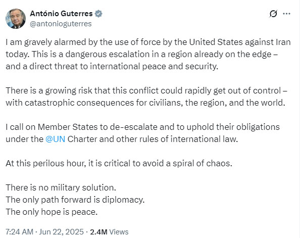 गुटेरेस ने दुनिया भर के देशों से अपील की है कि वे संयम बरतें और अंतरराष्ट्रीय कानून और संयुक्त राष्ट्र चार्टर के तहत अपनी जिम्मेदारियां निभाएं। उन्होंने दो टूक कहा – “इस बेहद संवेदनशील समय में अराजकता से बचना जरूरी है। सैन्य समाधान इस संकट का जवाब नहीं हो सकता। कूटनीति ही आगे का रास्ता है। शांति ही एकमात्र आशा है।”